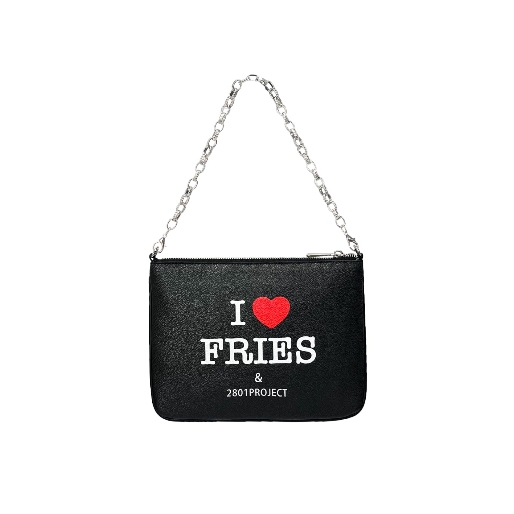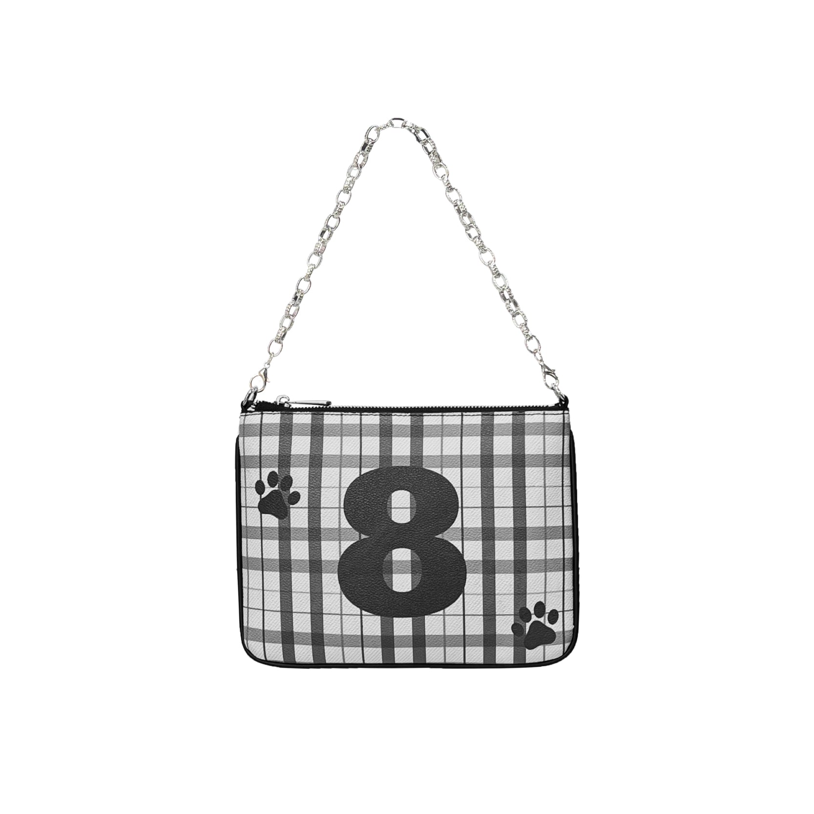 Compact shoulder bag with with different prints on each side. Zip closure and silver chain strap.