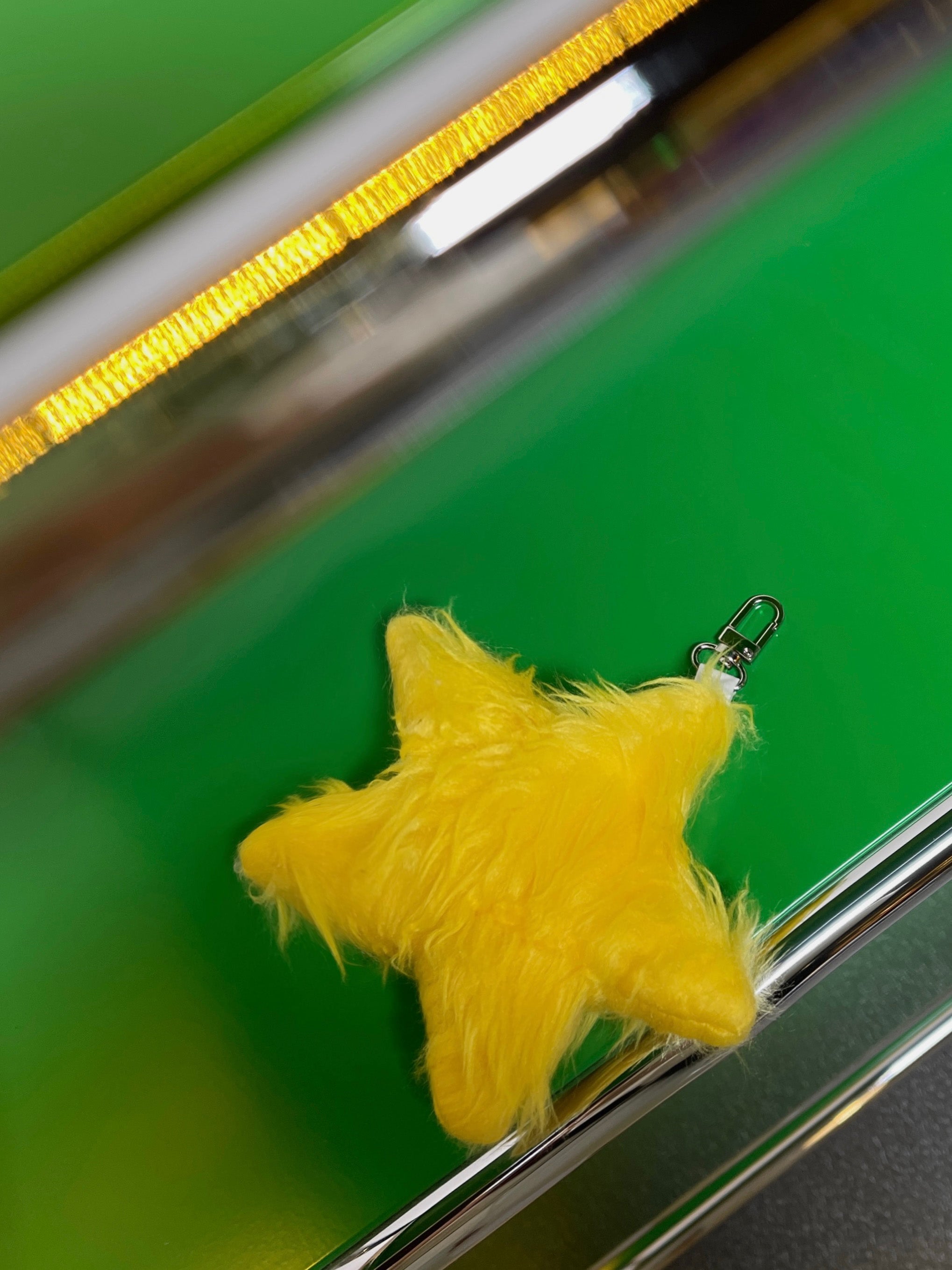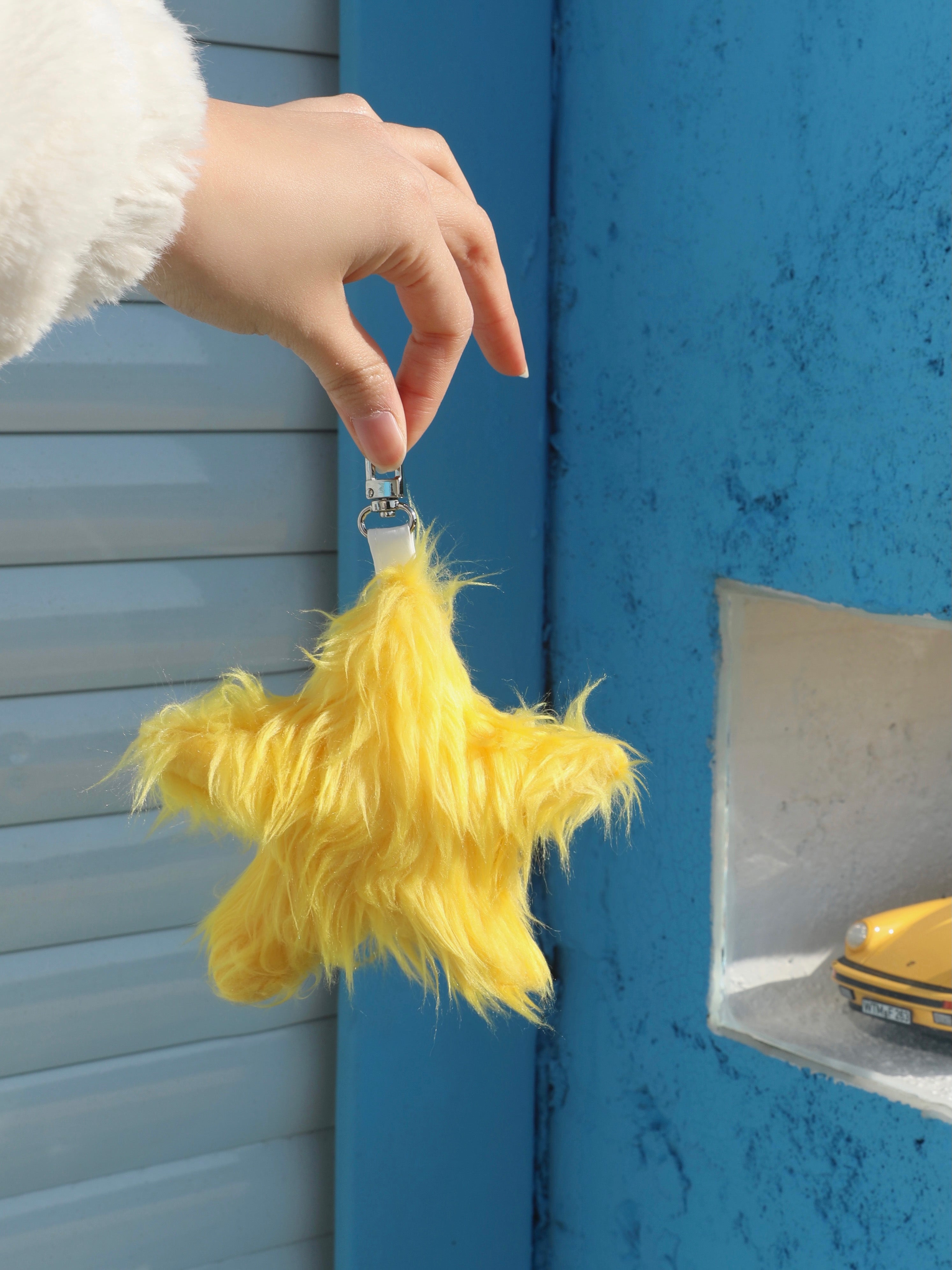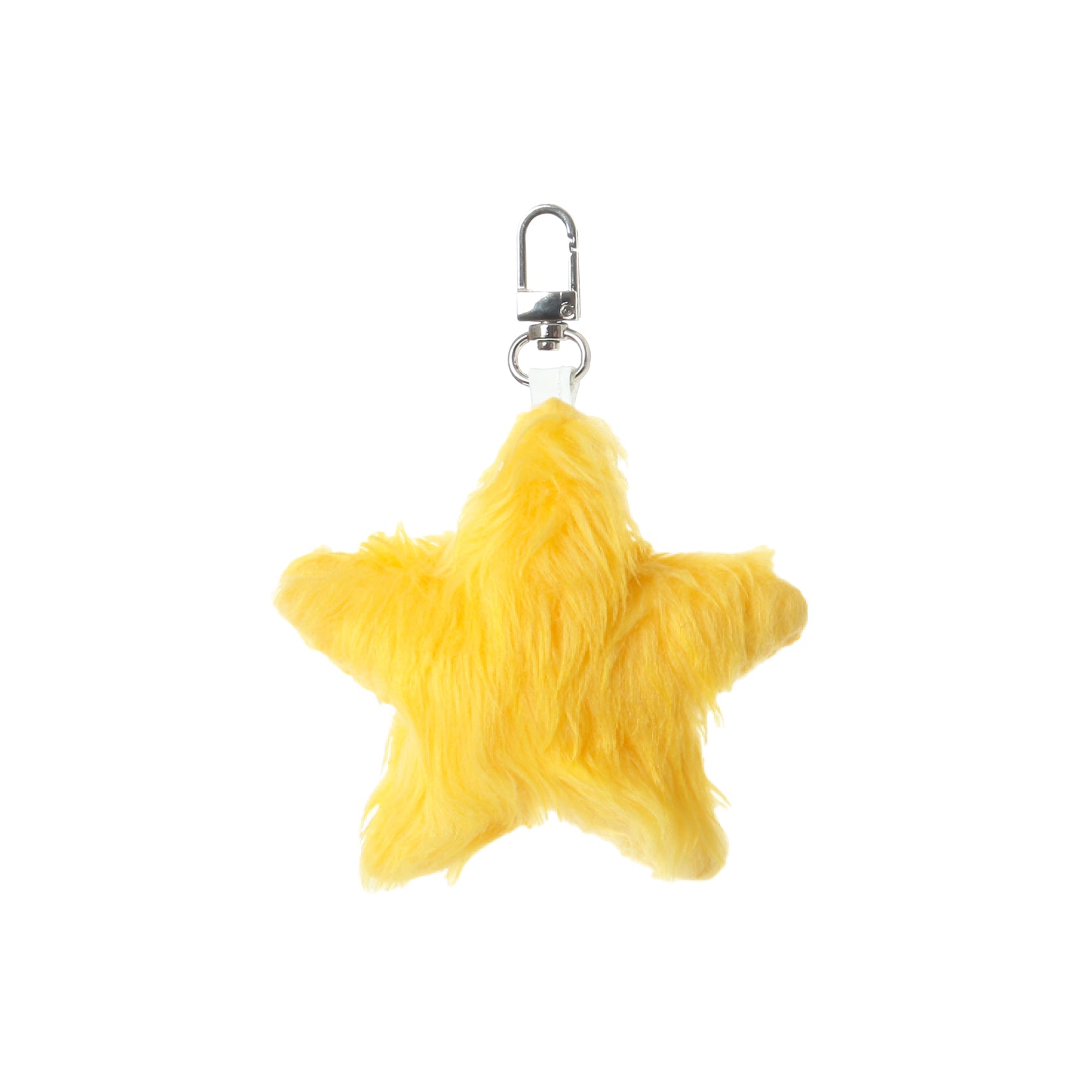 Furry yellow star-shaped bag charm with a soft texture.