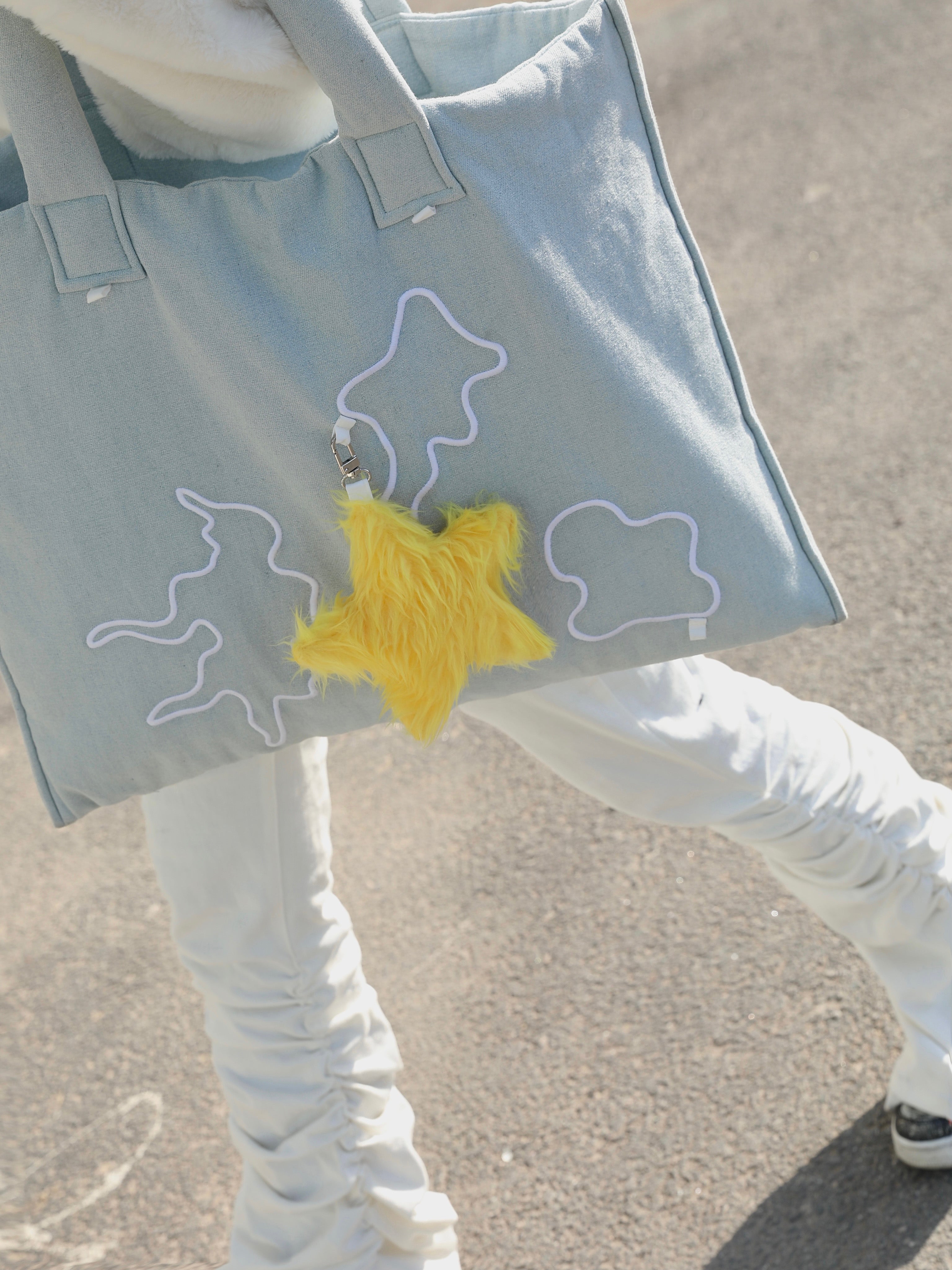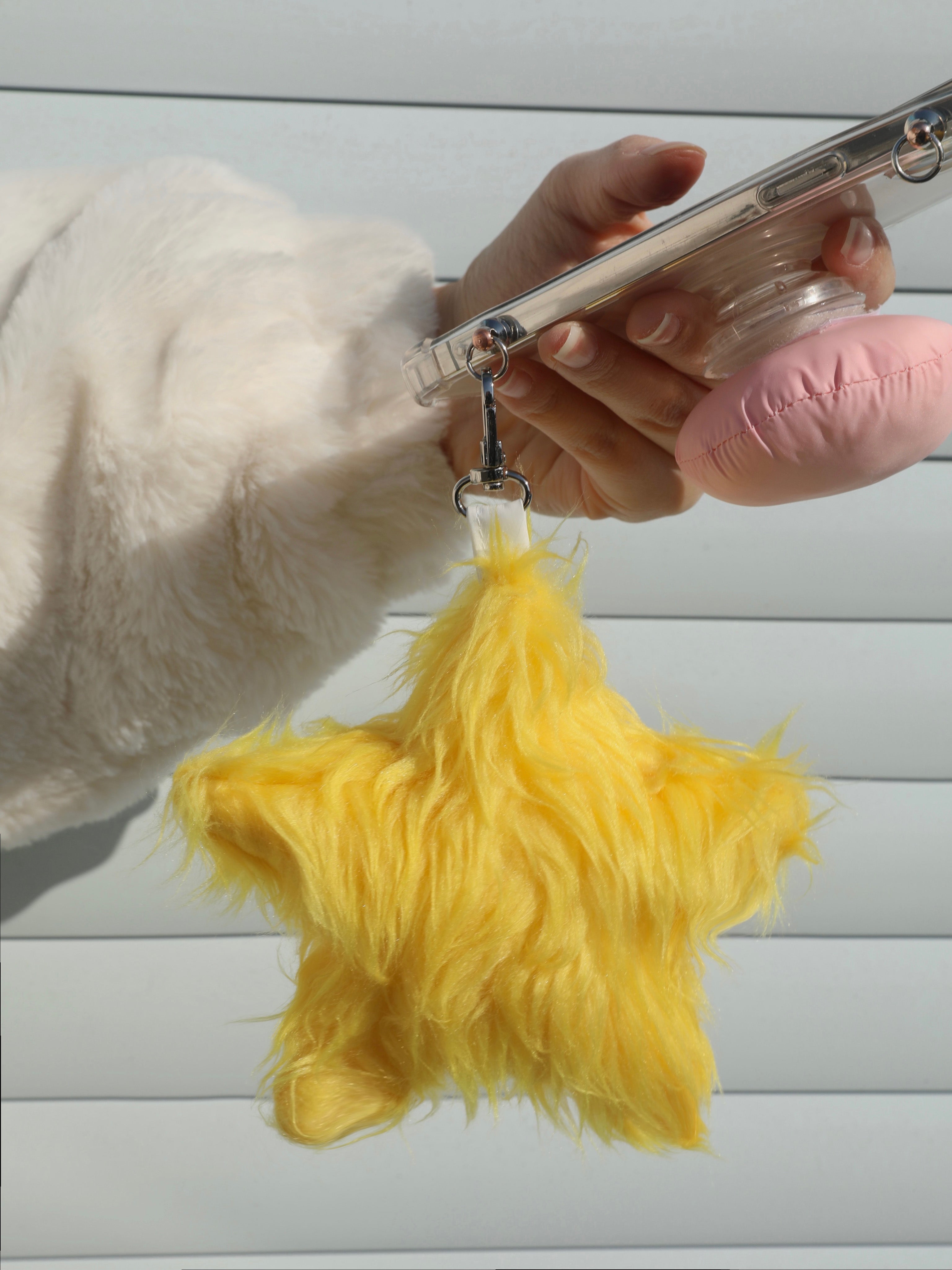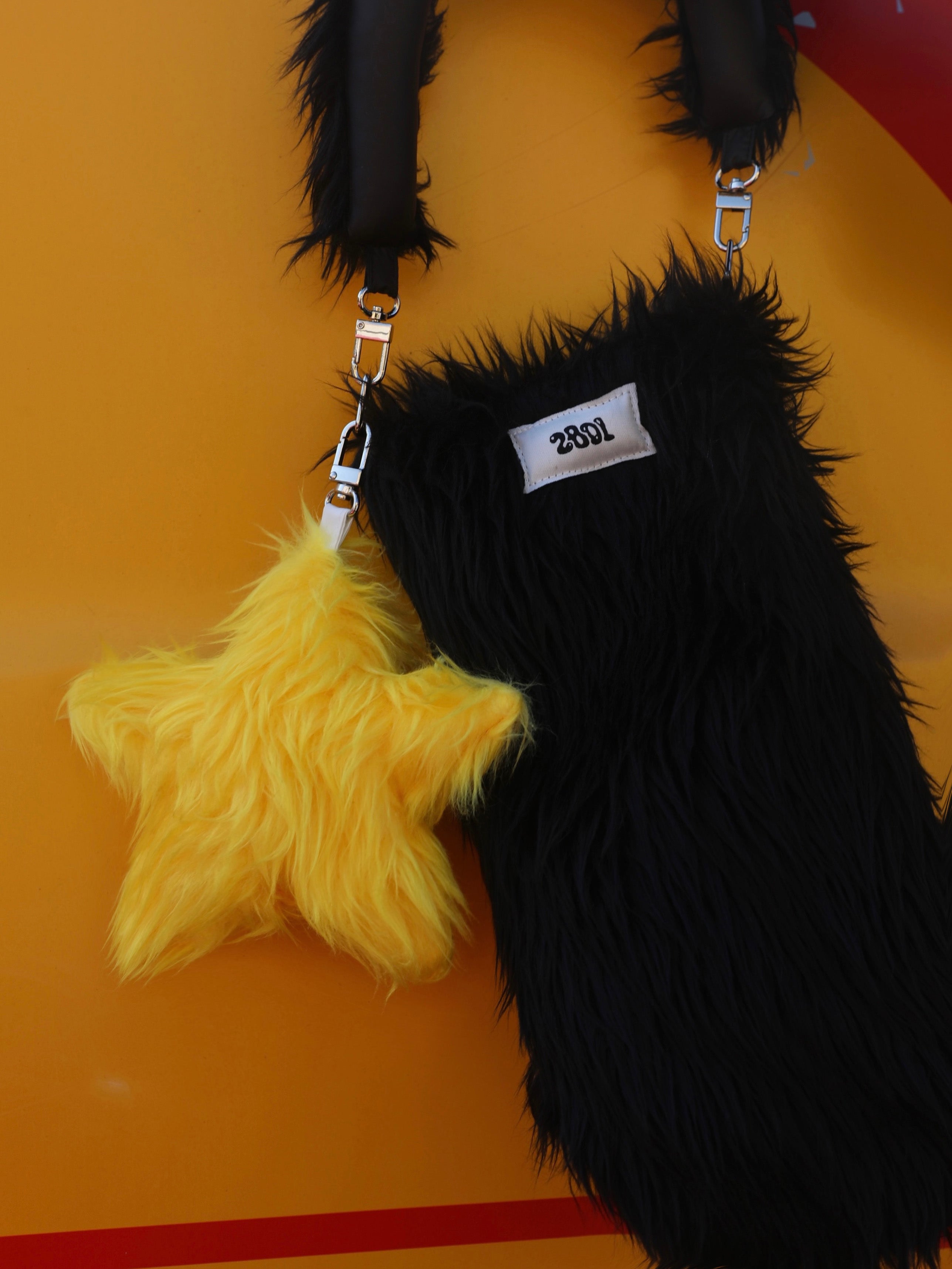 Furry yellow star-shaped bag charm with a soft texture.
