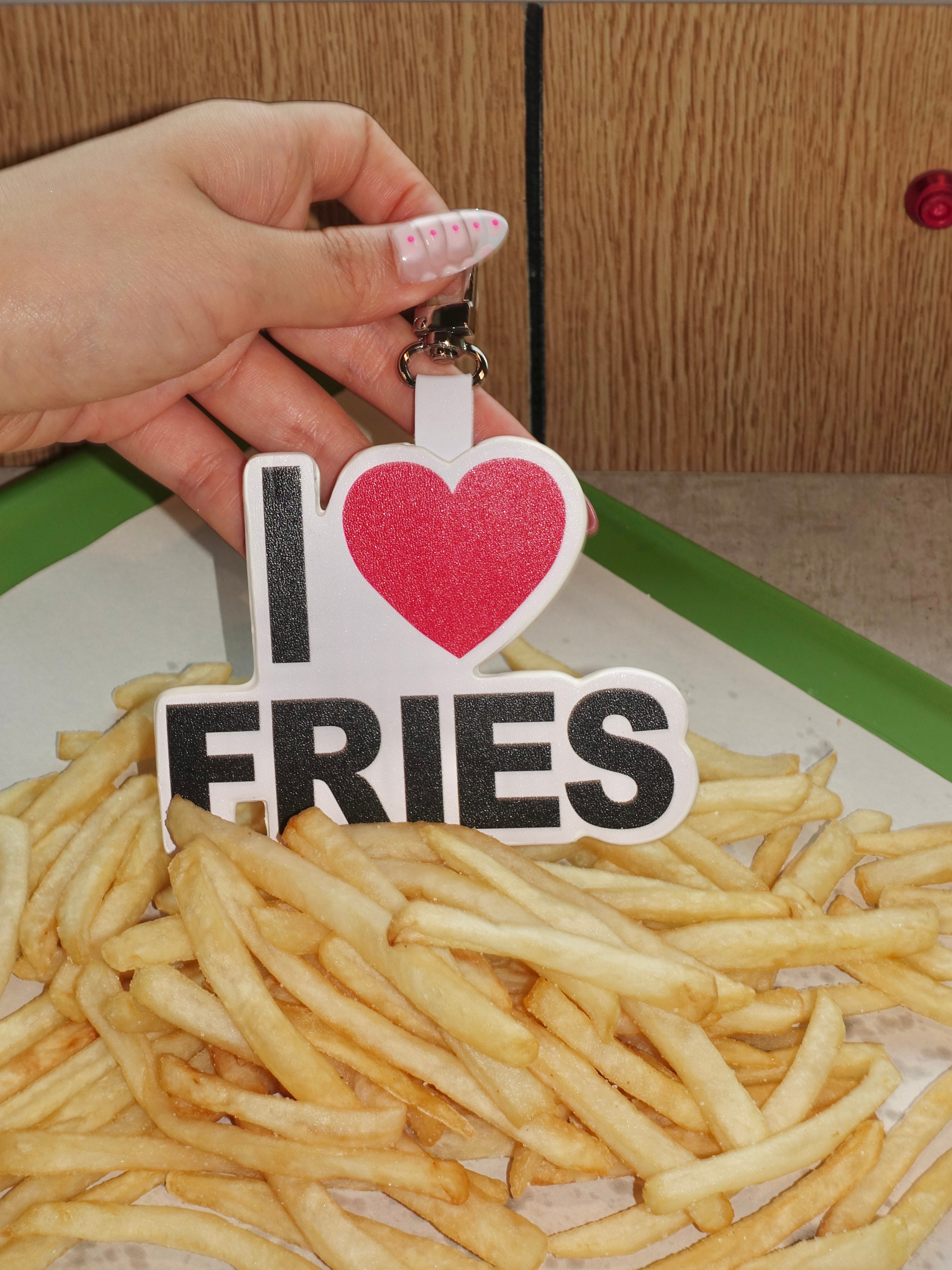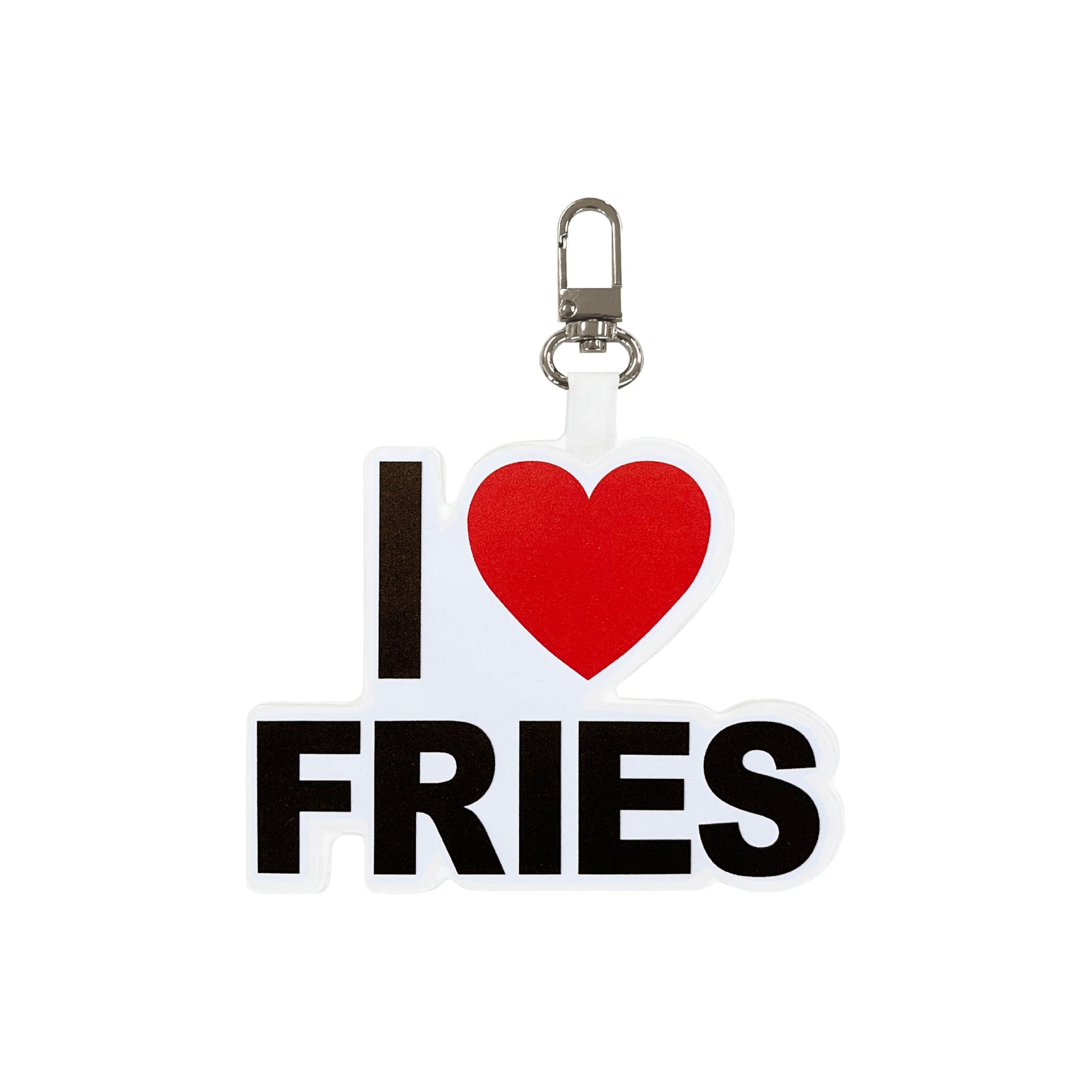 Leather bag charm featuring an "I Love Fries" design—a bold statement for fry lovers.