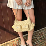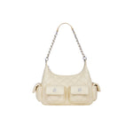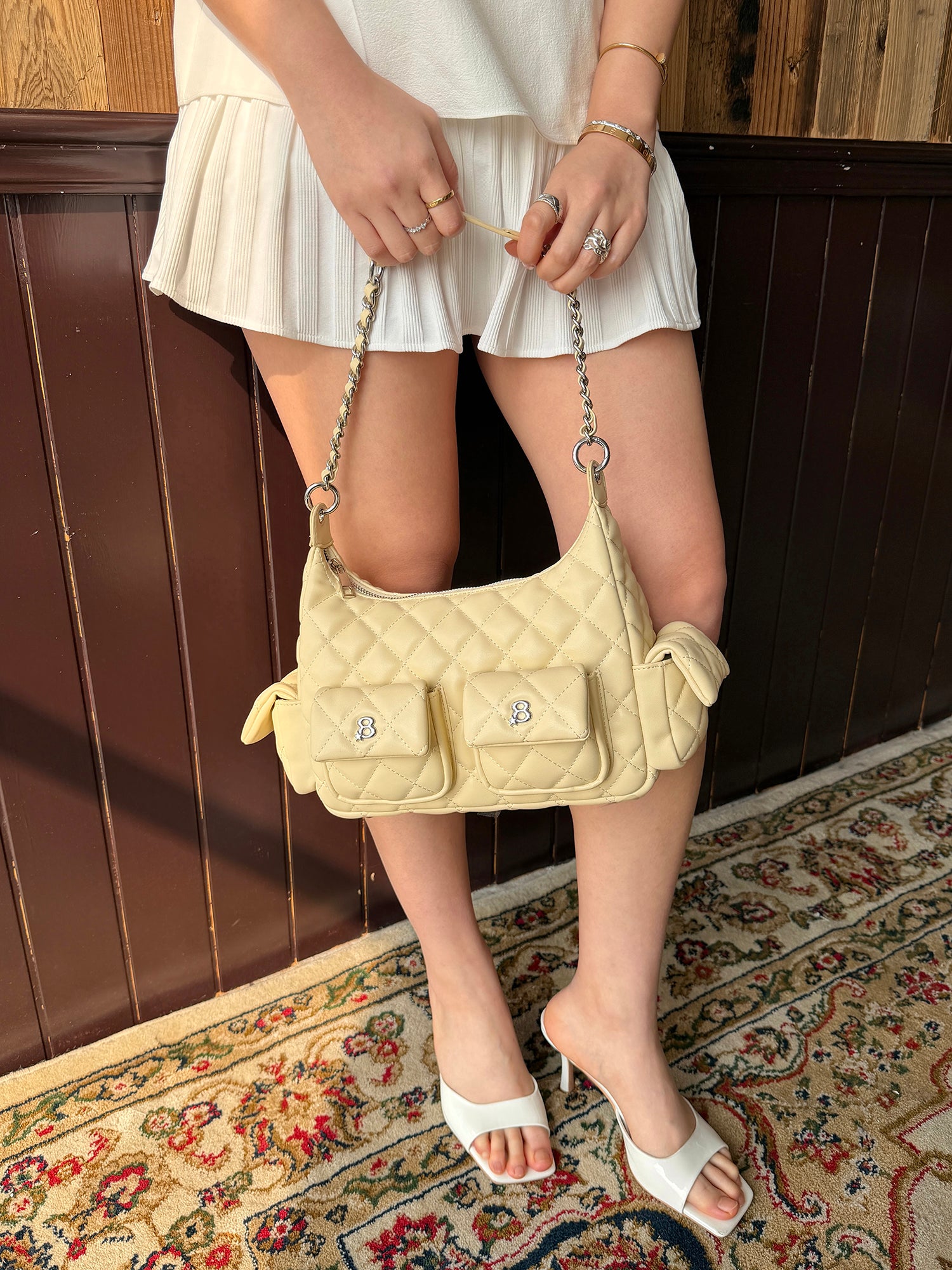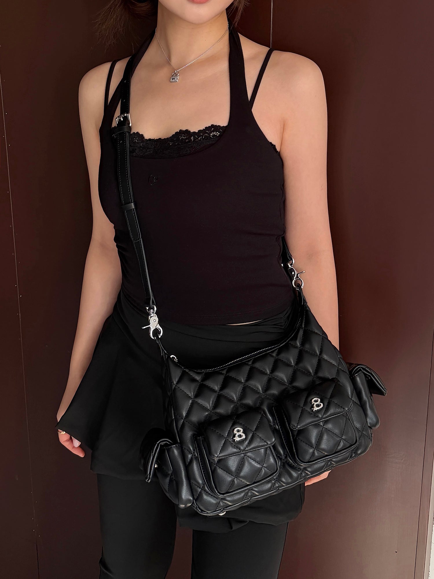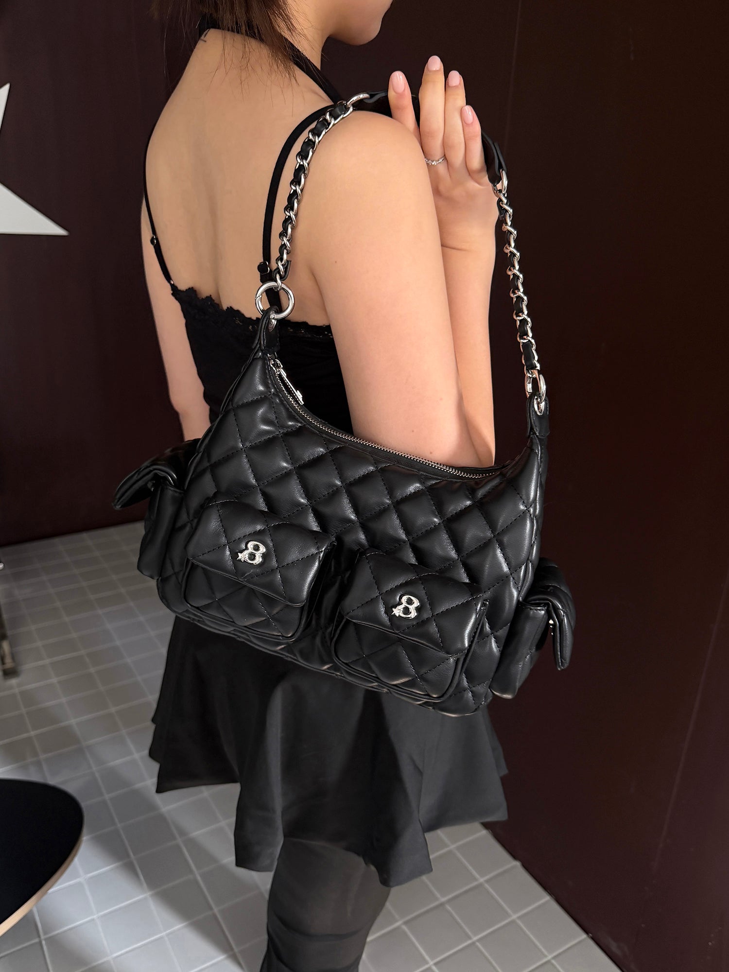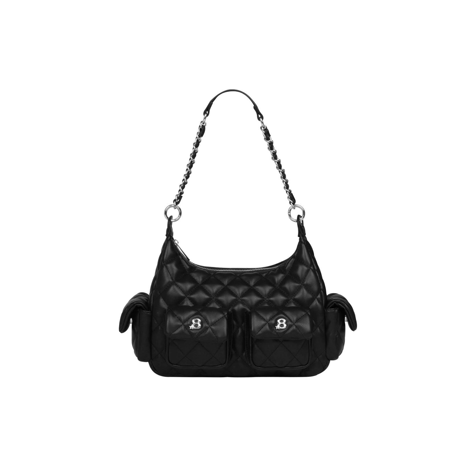 A quilted streetwear hobo bag featuring multiple utility pockets, silver-tone chain hardware, and signature "8" star emblems.