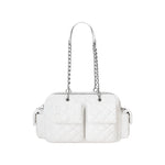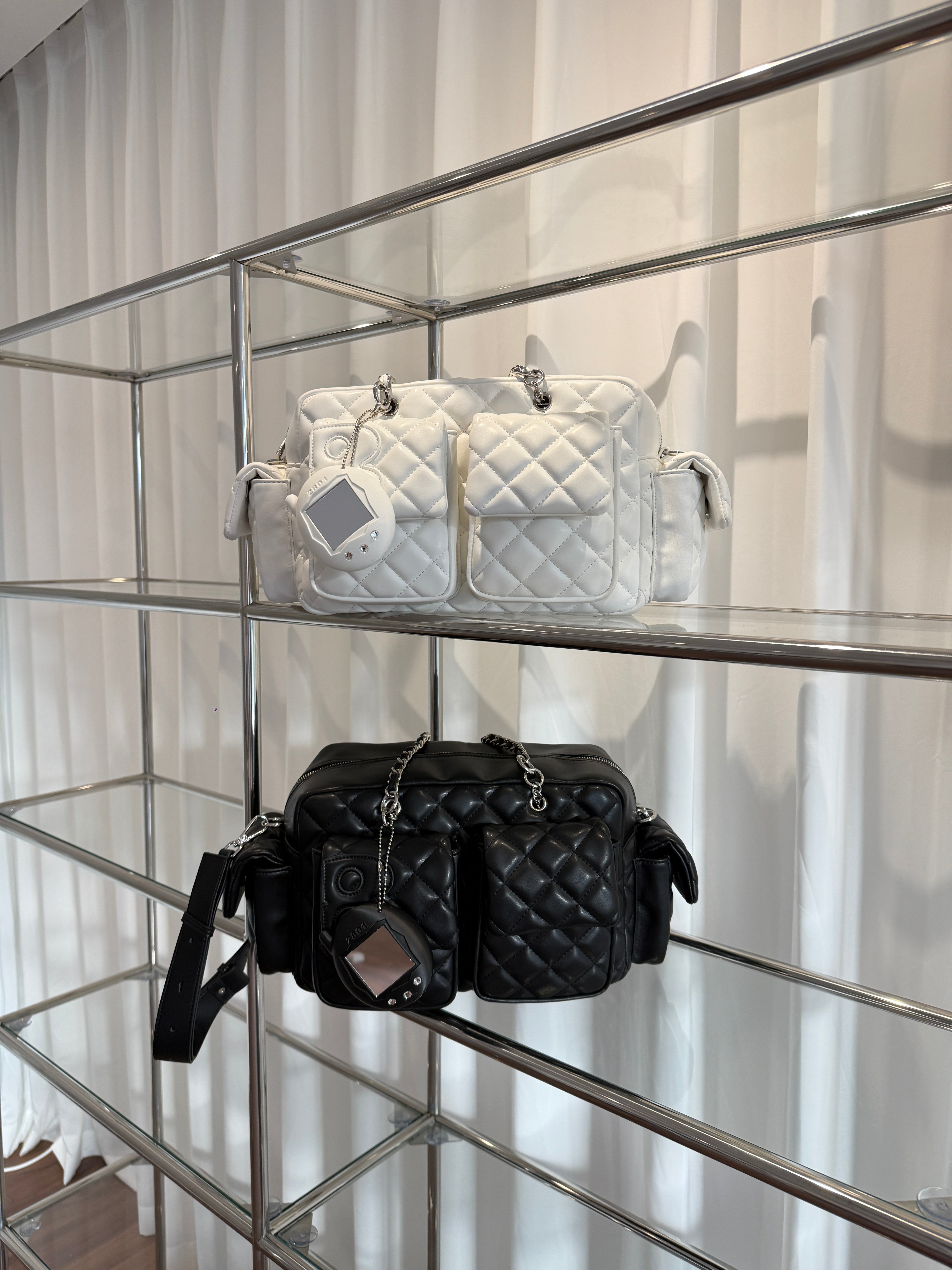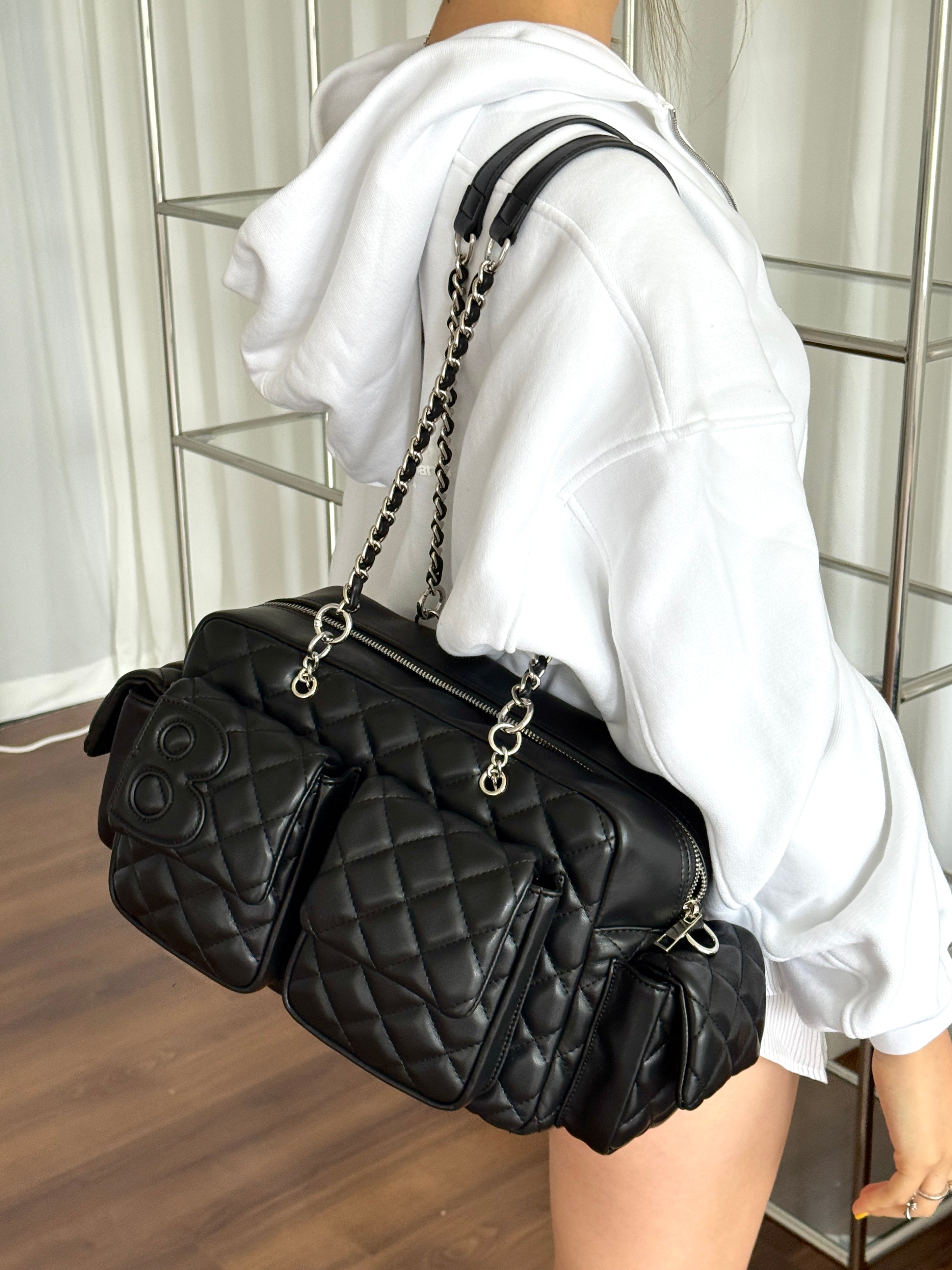 The Moto Bag features a padded quilted body and embossed “8” logo. A playful nod to classic biker gear with a soft, structured silhouette. Comes with a Tamagotchi bag charm.
