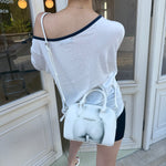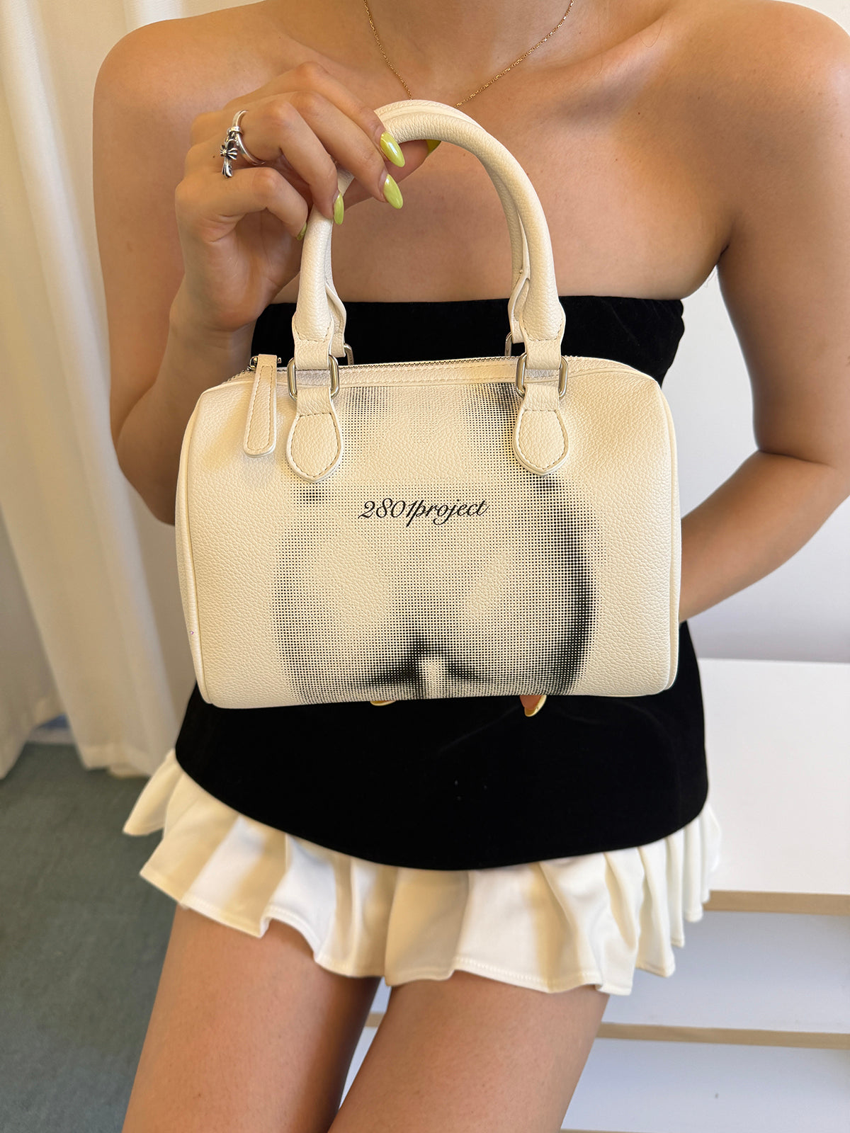 Structured Boston silhouette featuring a bold halftone bikini graphic and “2801project” logo detail. Pebbled texture finish with silver-tone hardware and secure zip closure. Includes dual top handles and a detachable strap for versatile crossbody or shoulder wear.
